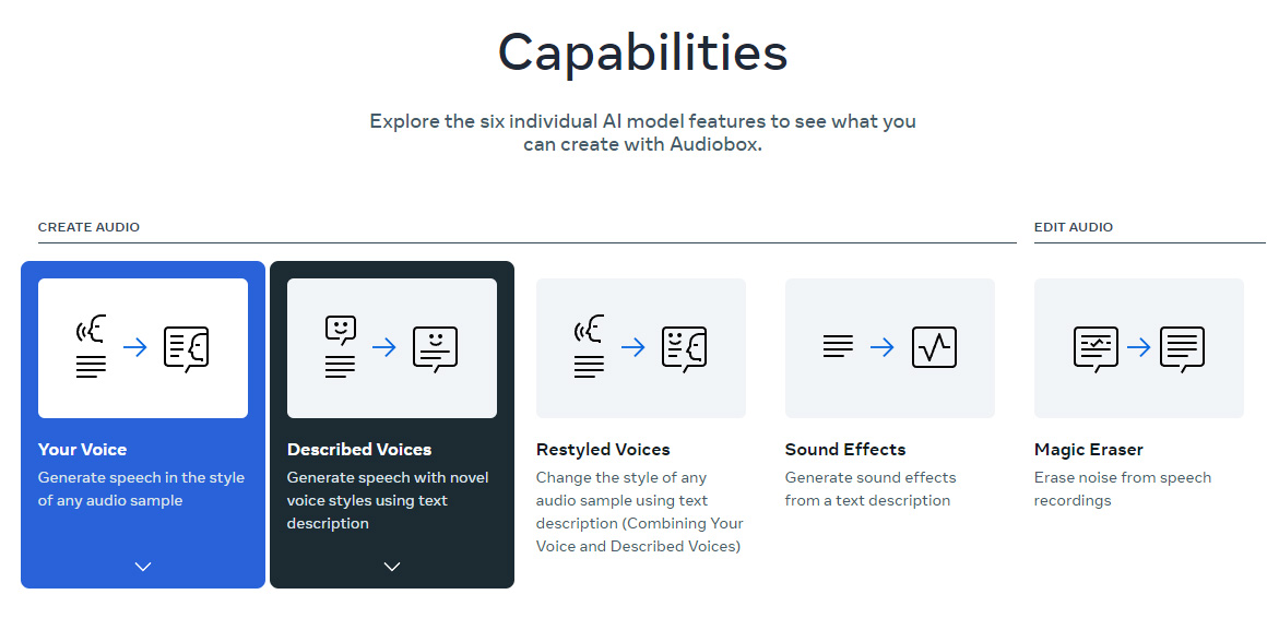 进入Audiobox网站即可使用,不需注册账户,界面简单易用,首页已列出AI语音和音频工具。