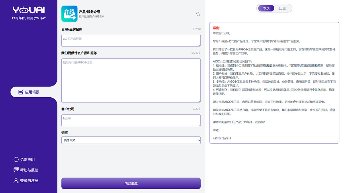 邮ai是一款智能邮件写作软件,凭借其先进的人工智能技术,让您轻松撰写生动有趣、专业精准的电子邮件,能过输入大概想要写邮件的内容,即可在几秒钟内生成标准的邮件内容。